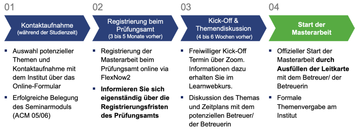 Nach erfolgreicher Zusage durch das Institut erfolgt die verpflichtende Anmeldung der Masterarbeit direkt beim Prüfungsamt. Dort finden Sie weitere allgemeine Informationen zur Anfertigung der Masterarbeit
