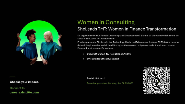 We would like to draw your attention to a career event organized by Deloitte, which offers female students interested in management consulting the opportunity to learn about “Women in Finance Transformation” at Deloitte Consulting on March 17, 2026, in their Düsseldorf office.