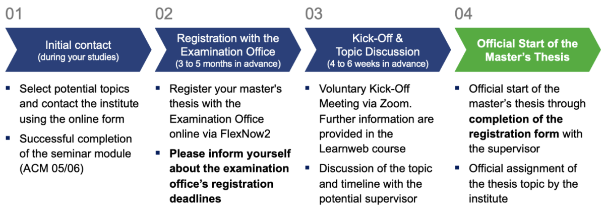 Below you will find an overview of the deadlines for the binding registration of the Master's thesis at the examination office and at our institute, depending on the issue period of the thesis: