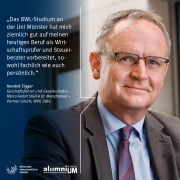 In Teil 23 der Alumni Stories stellen wir Hendrik Tigger vor. Nach seiner Ausbildung zum Industriekaufmann studierte er Betriebswirtschaftslehre an der Wirtschaftswissenschaftlichen Fakultät. Heute ist Hendrik Tigger sowohl Steuerberater als auch Wirtschaftsprüfer und als Geschäftsführer und Gesellschafter zweier Gesellschaften tätig: der Merco GmbH StBG sowie der Dr. Merschmeier + Partner GmbH, WPG StBG, beide mit Sitz in Münster. Während er bei Merco vor allem kleine und mittelständische Unternehmen sowie Privatpersonen in steuerlichen Fragen berät, liegt sein Schwerpunkt bei Dr. Merschmeier + Partner auf der Wirtschaftsprüfung, insbesondere im sozialen Sektor und bei Unternehmen der öffentlichen Hand, die er zudem steuerlich und betriebswirtschaftlich begleitet.
