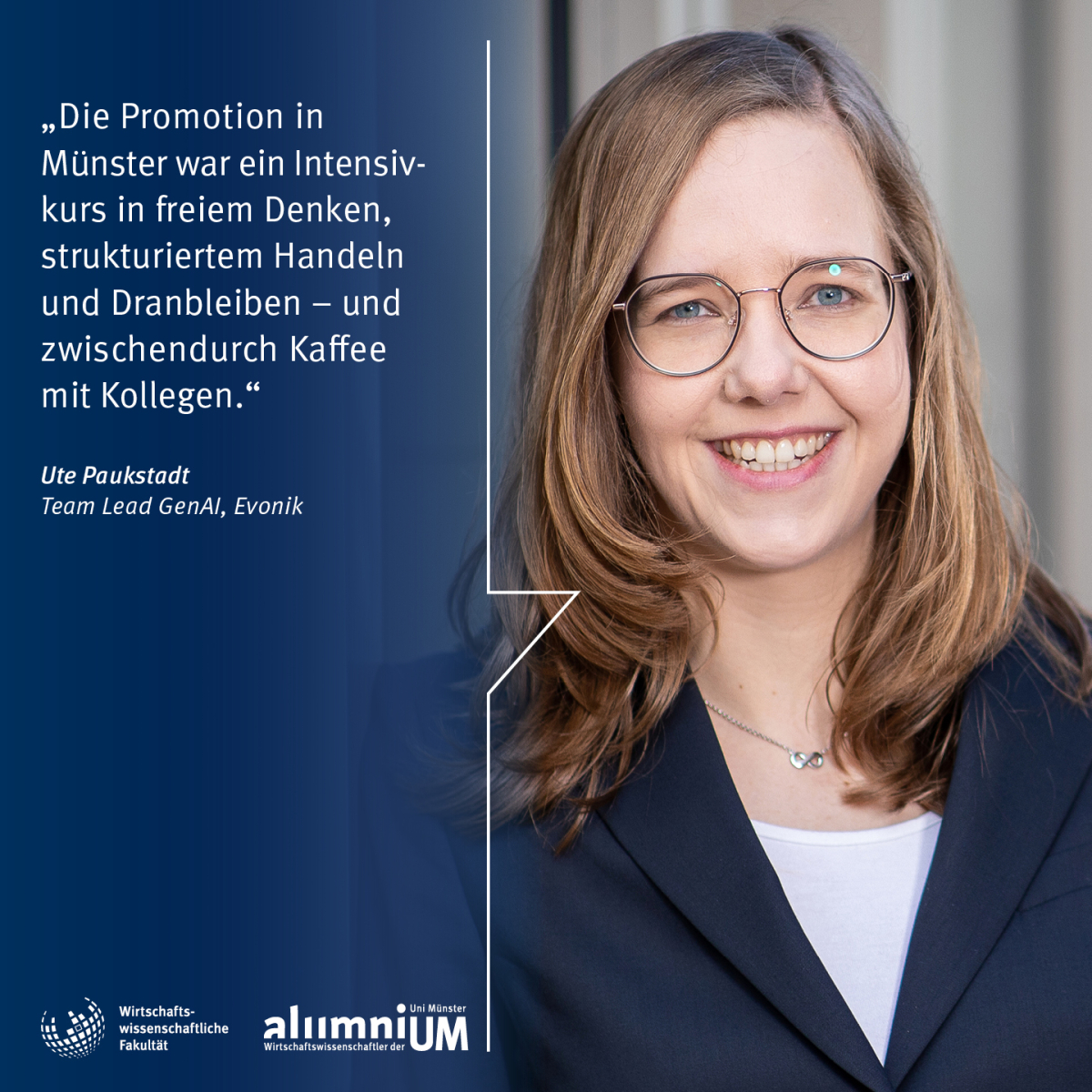 Nach dem Studium zieht es viele Absolvent:innen in die Unternehmenswelt. Einige bleiben der Wirtschaftswissenschaftlichen Fakultät aber auch als Nachwuchswissenschaftler:innen erhalten oder kommen erst für ihre Promotion an den FB4. Diesen Weg wählte auch Dr. Ute Paukstadt, die ihr Studium an der Universität Duisburg-Essen absolvierte, bevor es sie für ihre Promotion im Bereich der Wirtschaftsinformatik nach Münster zog. Nach dem Abschluss ihrer Promotion begann Ute Paukstadts außeruniversitäre Laufbahn als Dozentin für IT-Systeme und IT-Management an der Hochschule für Polizei und öffentliche Verwaltung Nordrhein-Westfalen (HSPV NRW). Zeitgleich arbeitete sie darüber hinaus auch als IT/ERP-Consultant. Im Jahr 2021 wechselte Ute Paukstadt als Senior Manager Digitalization zu Evonik, wo sie ab August 2022 die Rolle des IT Product Managers/Product Owners für „Digital Business“ und „Generative Artificial Intellligence“ (GenAI) übernahm. Seit dem 01. April 2025 ist Ute Paukstadt Teamleiterin für GenAI bei Evonik.