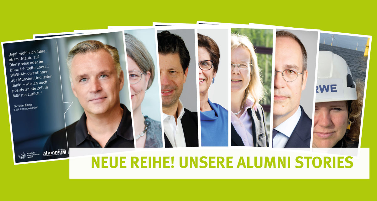Die Wirtschaftswissenschaftliche Fakultät sowie ihr Ehemaligenverein, AlumniUM, präsentieren die „Alumni Stories“ – eine Interviewreihe, in der Absolventinnen und Absolventen der Fakultät ihre Karrierewege und Erlebnisse an der Universität Münster teilen. In den Beiträgen berichten unsere Alumni über Erfolge und Herausforderungen ihrer beruflichen Laufbahn und geben wertvolle Einblicke in ihren Praxisalltag in Banken, Unternehmensberatungen, Stiftungen, im Bereich der Erneuerbaren Energien, u.v.m. So erfahren wir nicht nur mehr über die Ehemaligen der Wirtschaftswissenschaftlichen Fakultät und wie ihr Studium sie bei ihrem Werdegang unterstützt hat, sondern zeigen auch die vielfältigen Karrierewege auf, die den Studierenden mit einem wirtschaftswissenschaftlichen Abschluss offenstehen.