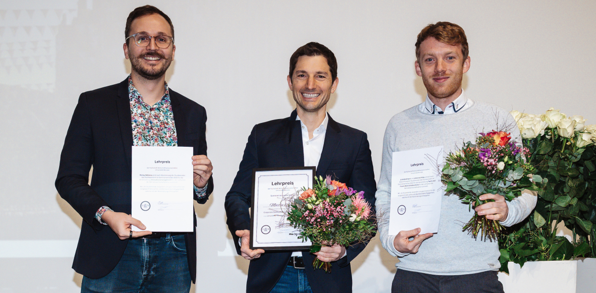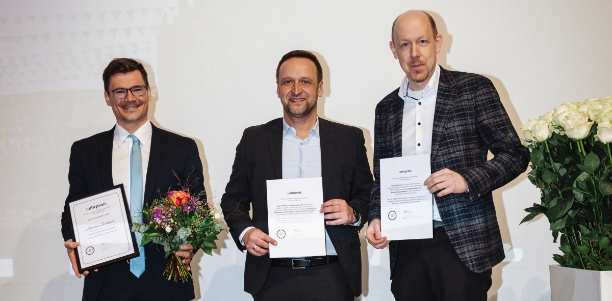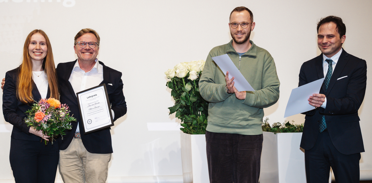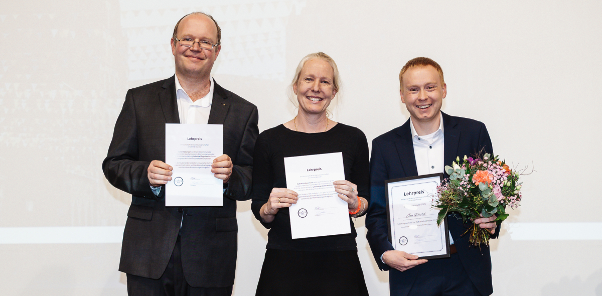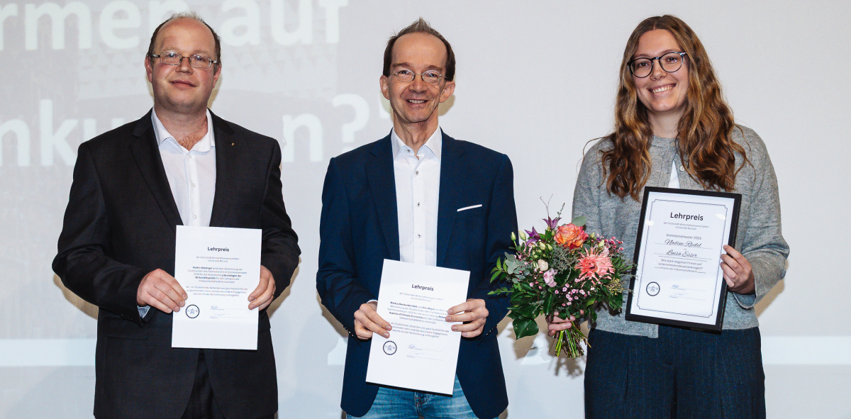 Die Fachschaft Wirtschaftswissenschaften hat im Namen der Studierenden die Auszeichnungen für besonders gute Lehre vergeben. In den drei Fächern Betriebswirtschaftslehre, Volkswirtschaftslehre und Wirtschaftsinformatik wurden jeweils drei Veranstaltungen im Bachelor- und im Masterstudium nominiert, aus denen das Gremium Lehrpreis die Gewinner:innen kürte. Der Lehrpreis wird seit 2010 von der Fachschaft Wirtschaftswissenschaften verliehen. Damit werden Dozentinnen und Dozenten des Fachbereichs für herausragende Leistungen in der Lehre belohnt. Verliehen wurden die Preise im Rahmen der Absolventenfeier, die ebenfalls von der Fachschaft WiWi organisiert wurde.