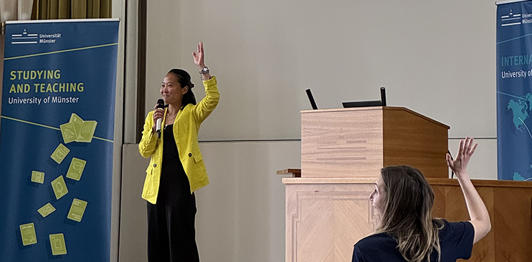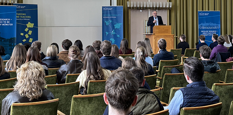 Auch in diesem Jahr kamen wieder viele Studieninteressierte ins Schloss der Universität Münster, um sich über die vier Masterstudiengänge der Wirtschaftwissenschaftlichen Fakultät zu informieren. Nach einem Grußwort von Dekan Prof. Dr. Thomas Langer folgten Einblicke in das Lehr- und Forschungsportfolio: Prof. Dr. Verena Rieger sprach im Rahmen von "Data-based Managerial Decision Making" über Struktur und Praxisbezüge der Studieninhalte, Prof. Dr. Thomas Apolte mit "The Political Economy of Mass Protests and Revolution" über ein hochaktuelles Forschungsthema und Dr. Fumi Kurihara über eines der großen Kooperationsprojekte, die "Flow Factory –AI Innovations in Financial Practice". Anschließend stellten die Programmmanager:innen Dr. Jan Niklas Dörseln, Dr. Helena Helfer und Dr. Lena Clever die einzelnen Studiengänge Business Administration, Business Development, Economics und Information Systems vor und beantworteten die Fragen der Studierenden. Parallel dazu konnten die Teilnehmenden auf der Expo im Schloss-Foyer mit Studierenden ins Gespräch kommen und sich beim Career Development Center und beim International Relations Center der Fakultät über Karriereperspektiven, Auslandssemester und vieles mehr informieren. Der Tag schloss mit einer Campus-Tour.
