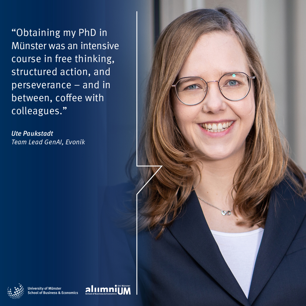 After graduation, many graduates are drawn to the corporate world. However, some remain at the School of Business & Economics as early-career researchers or join later for their doctoral studies. This was also the path chosen by Dr. Ute Paukstadt, who completed her studies at the University of Duisburg-Essen before moving to Münster to pursue her PhD in Information Systems. After completing her doctorate, Ute Paukstadt began her career outside academia as a lecturer for IT systems and IT management at the University of Applied Sciences for Police and Public Administration in North Rhine-Westphalia (HSPV NRW). At the same time, she also worked as an IT/ERP consultant. In 2021, Ute Paukstadt joined Evonik as Senior Manager Digitalization, where, from August 2022, she took on the role of IT Product Manager/Product Owner for “Digital Business” and “Generative Artificial Intelligence” (GenAI). Since April 1, 2025, Ute Paukstadt has been Team Lead for GenAI at Evonik.