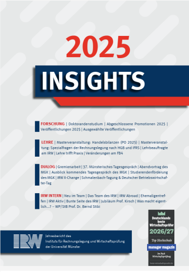 In den bekannten Bereichen „Forschung“, „Lehre“, „Dialog“ und „IRW Intern“ finden Sie spannende Beiträge zu aktuellen Ereignissen und Neuigkeiten aus den Forschungsbereichen Rechnungslegung und Wirtschaftsprüfung sowie zum Leben am Institut.