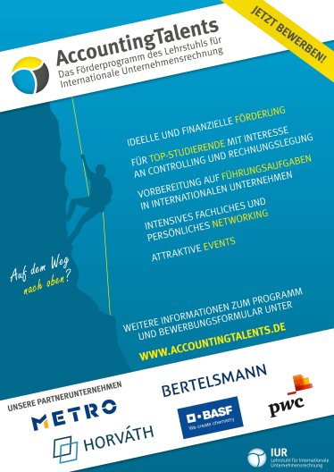 AccountingTalents, das Förderprogramm des Lehrstuhls für Internationale Unternehmensrechnung, sucht zum Sommersemester 2026 wieder neue Mitglieder. Studierende mit überdurchschnittlichen Studienleistungen und starkem Interesse am Fachgebiet Controlling und Rechnungslegung können sich bis zum 19. April 2026 für das IUR-Förderprogramm bewerben. Weitere Informationen zum Programm und zur Bewerbung erhalten Sie hier.
