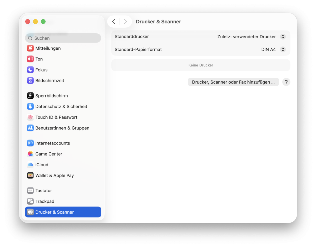 - Für die Einbindung eines Netzwerkdruckers unter macOS öffnen Sie die Systemeinstellungen und scrollen Sie nach unten bis zu dem Punkt "Drucker & Scanner". Dort wird eine Liste an bereits eingebundenen Drucker angezeigt. Klicken Sie anschließend auf die Schaltfläche "Drucker, Scanner oder Fax hinzufügen...".