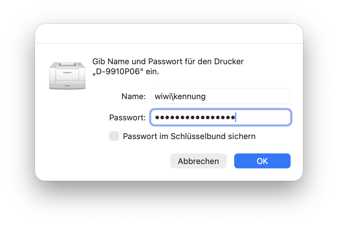 Möchten Sie einen Netzwerkdrucker nutzen, für den Sie bisher keine Berechtigungen besitzen, nehmen Sie bitte Kontakt mit dem Support der IVV Wirtschaftswissenschaften auf. Halten Sie bitte den Druckernamen und Ihre WIWI-Kennung bereit.